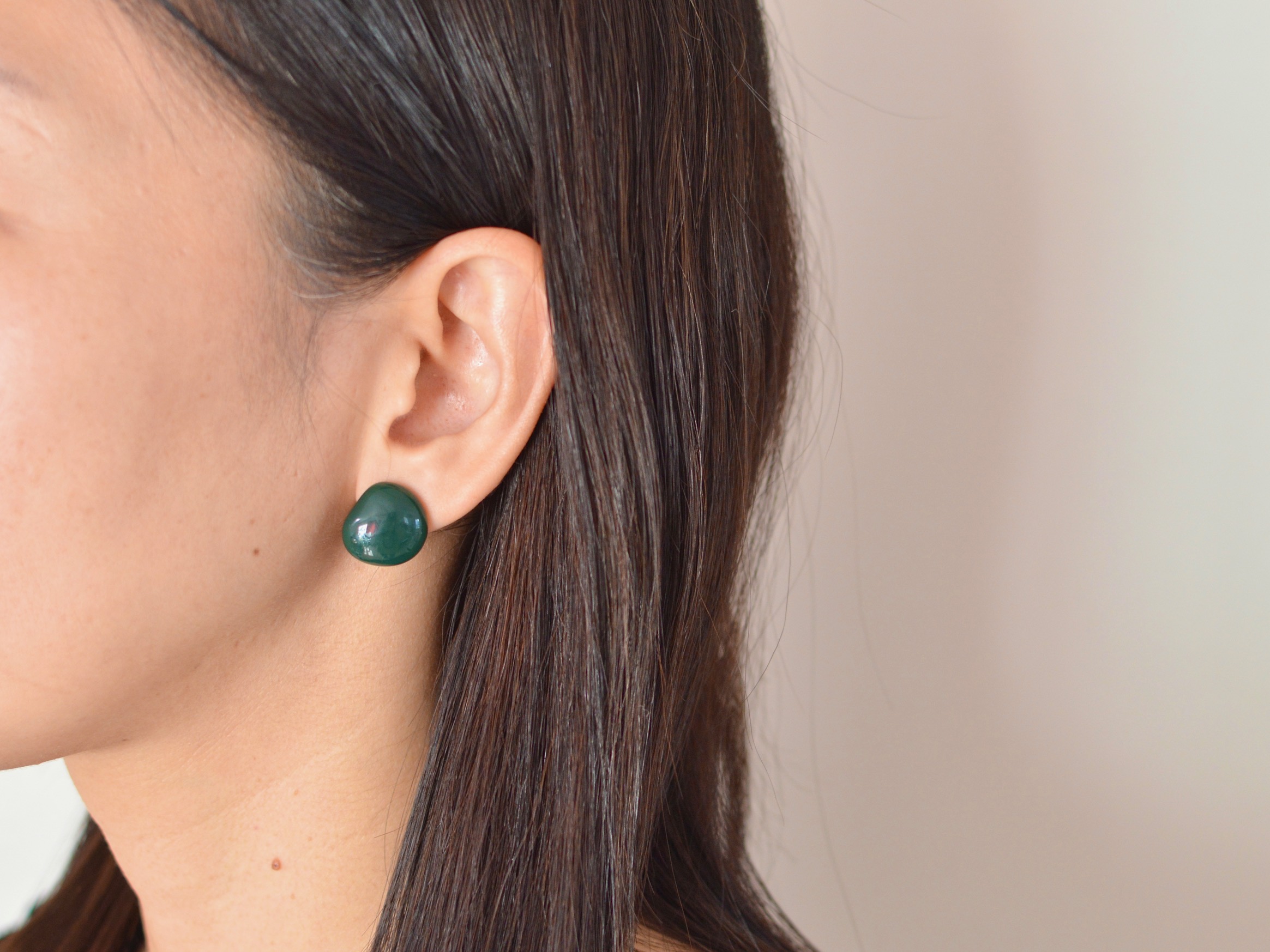 もう片方はころんとした丸みのある艶やかな質感が、耳元に明るさと遊び心を添えてくれます。